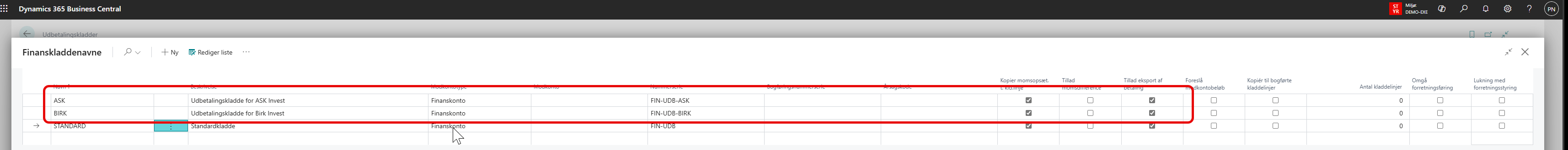 Eksempel på udbetalingskladder opdelt per juridisk enhed: