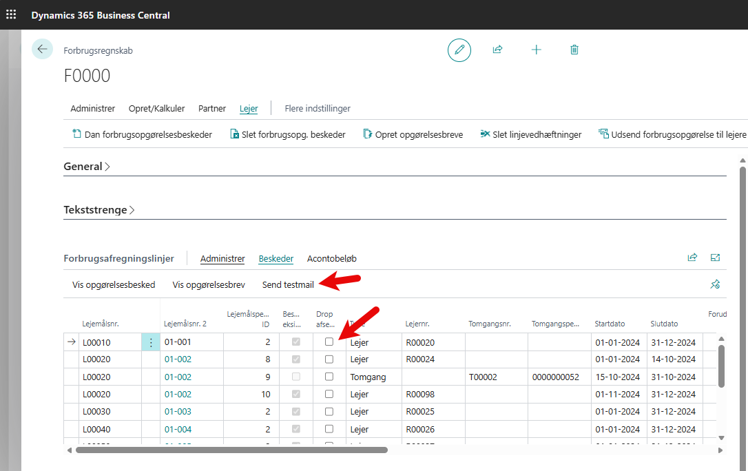 • Send testmail: På forbrugsregnskabet er der lavet et felt hvor en testmail kan indtastes. Under linjerne findes en knap hvor en mail vil afsendes til testmailen i stedet for lejeren.