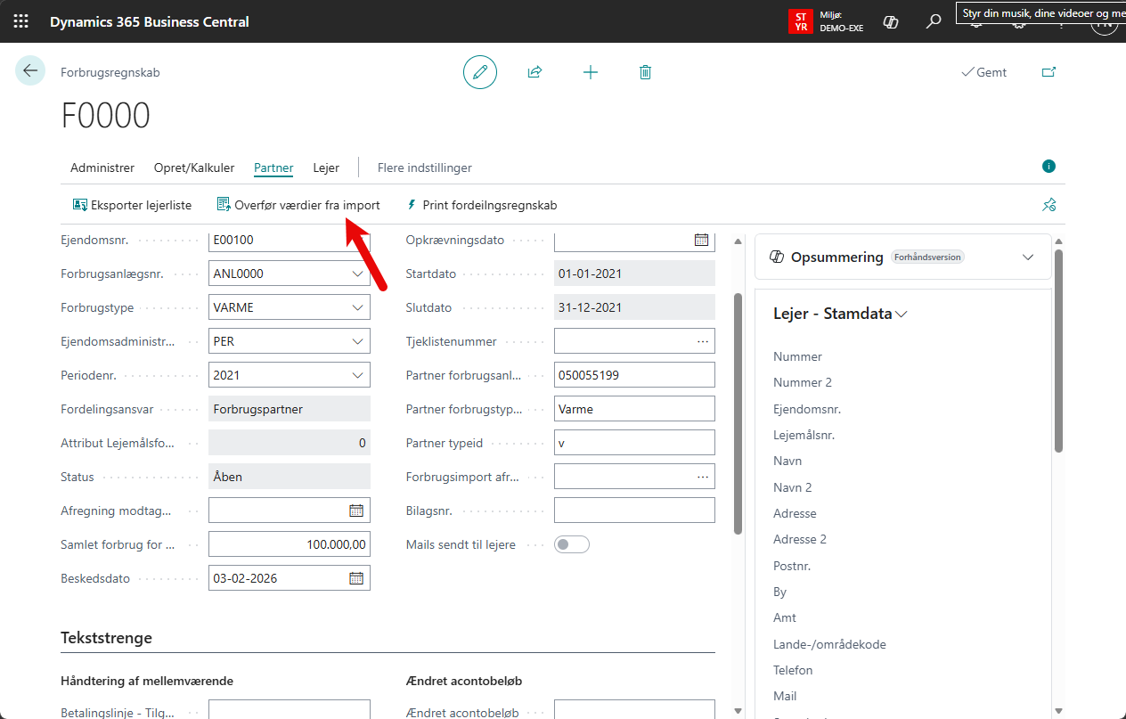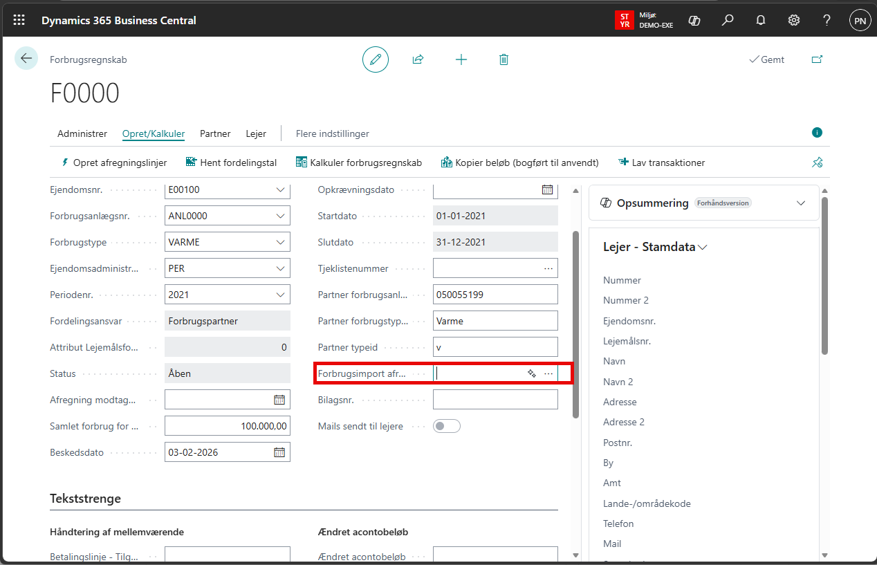 Ved overfør værdier fra import opdateres forbrugsafregningslinjerne med forbruget.