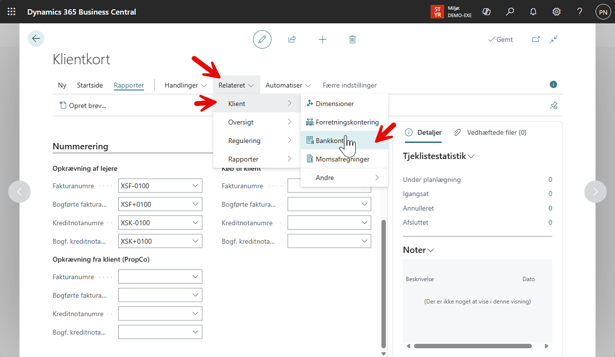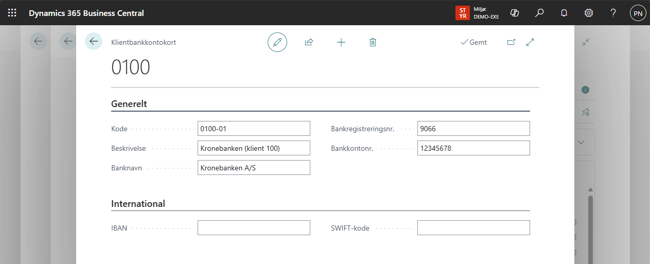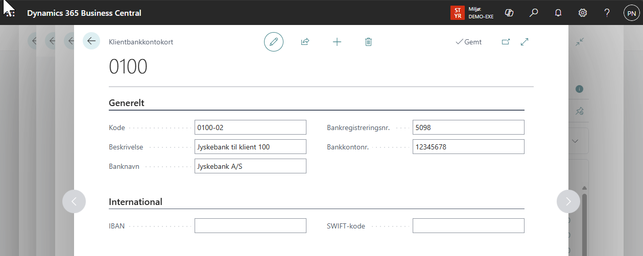 Opsætningen bygger her på at klienten har en bankkonto, men anvendes flere bankkonti, kan disse opsættes fra klientkortet. Se gennemgangen til sidst.