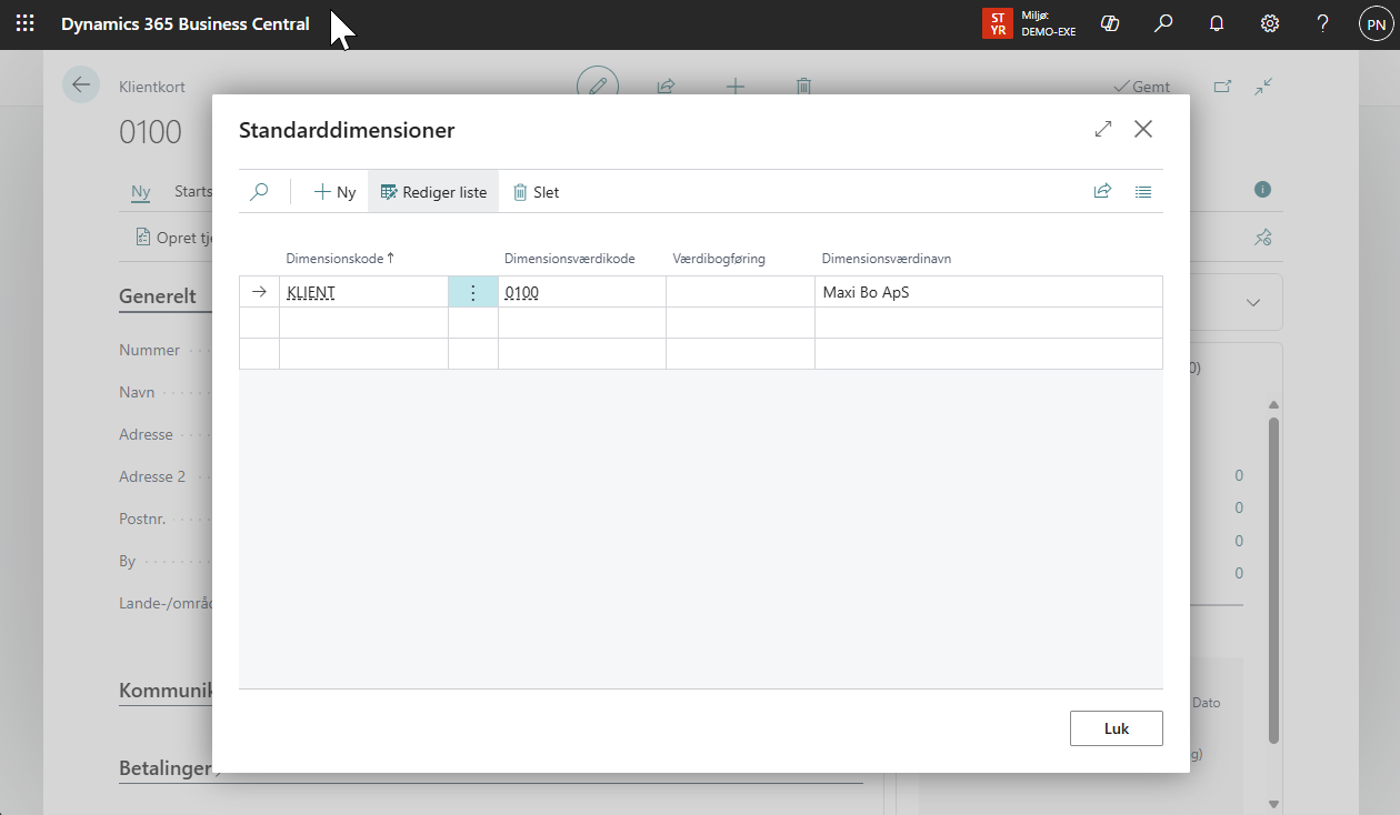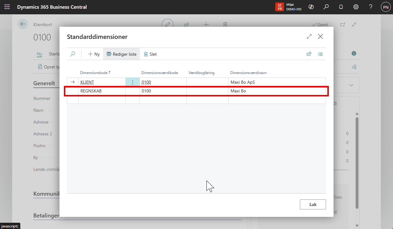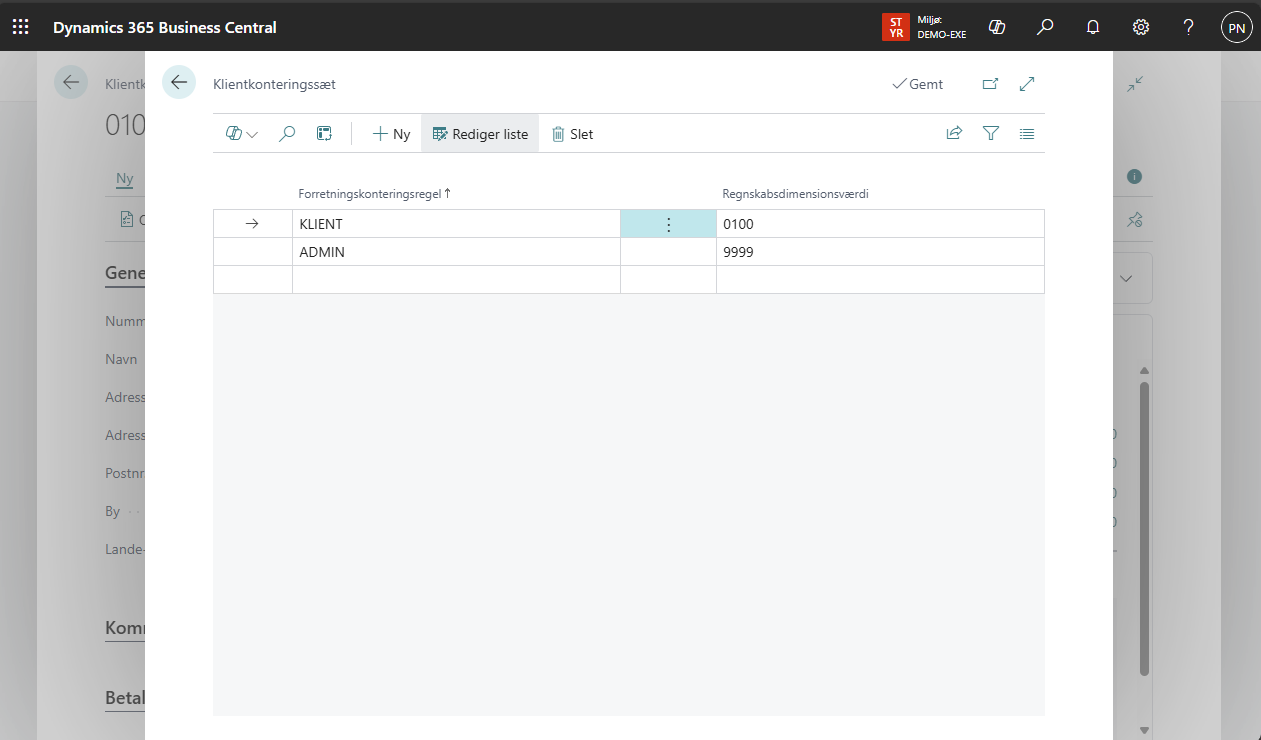 1. Arbejder du ikke med et administrationsregnskab, vil det altid være klientregnskabet du rammer når du arbejder med klientkortet. Her bør du oprette en dimensionsværdi til regnskabet, der svarer til klientkortet og tildele dette til klientkortet.