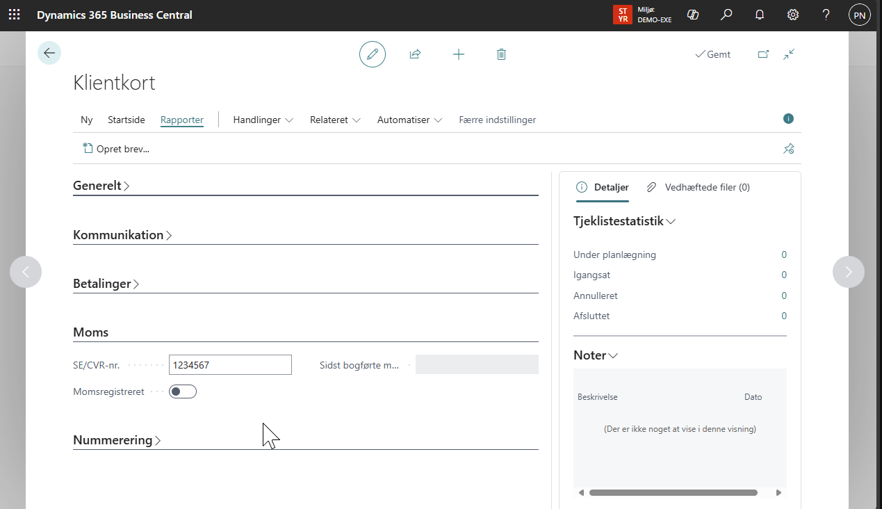 Det anbefales at sætte feltet momsregistreret til "Sand" hvis aktuelt. I nærværende eksempel er klienten ikke momsregistret, hvorfor feltet er sat til falsk.