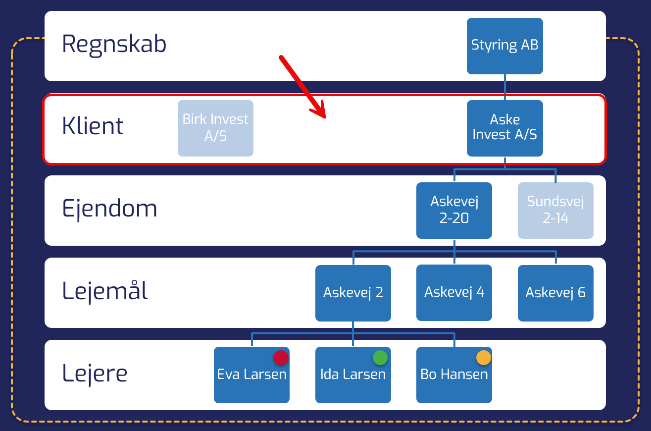 Klienten er ejendomsejeren og der er som minimum en ejendomsejer. En klienten / ejendomsejeren, har 0, 1 eller flere ejendomme. Klienten er i toppen af hierarkiet, da regnskabet er implicit.