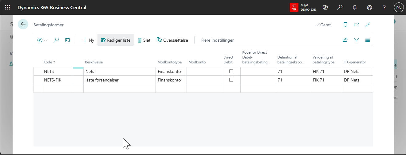 2. Opret betalingsformskoden NETS og betalingsformskoden Nets-FIK