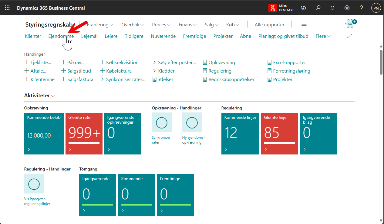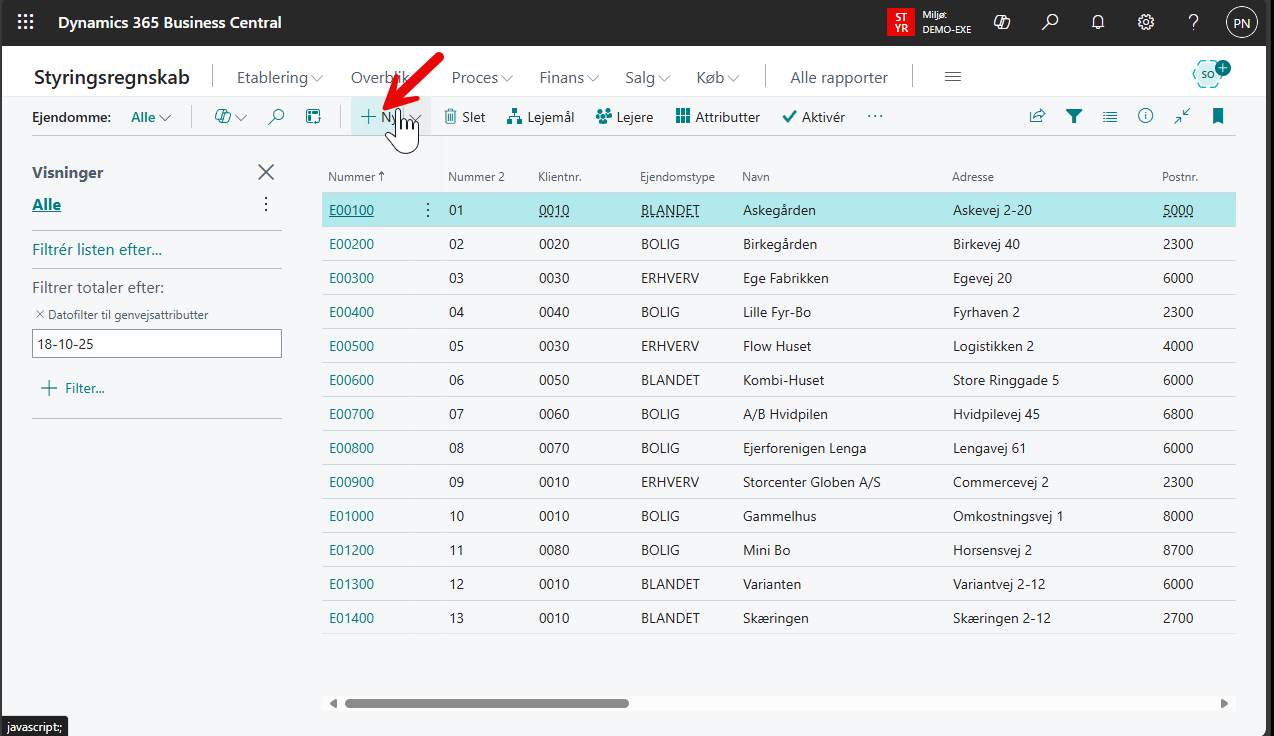 2. Listen med ejendomme fremkommer. tryk nu på "Ny"