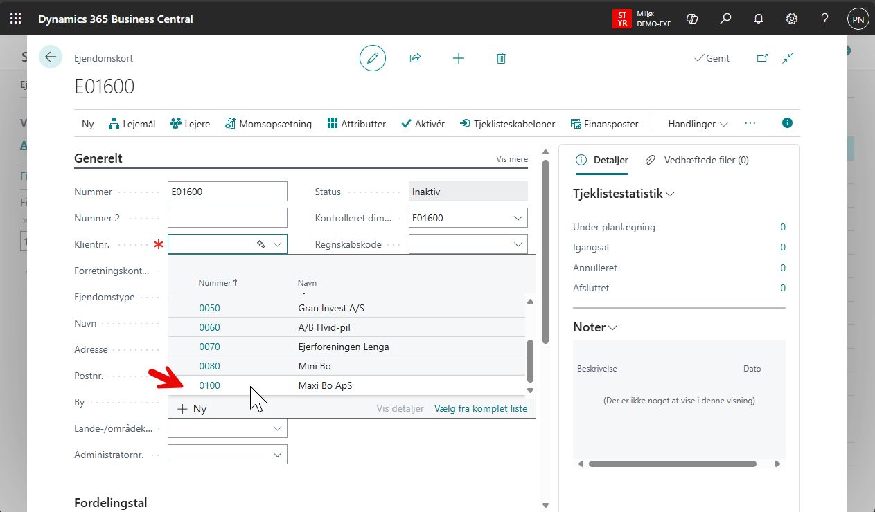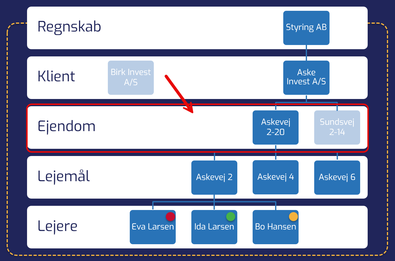Ejendommen ejes af en klient og har 0 eller flere lejemål.